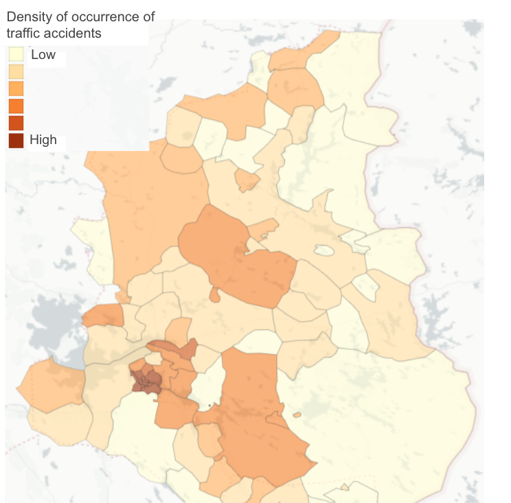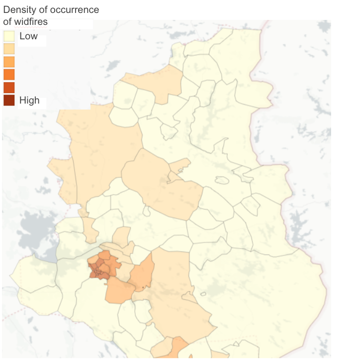 Wildfires and traffic accidents are difficult to forecast on the basis of the available data, because they are not directly linked to where people live. However, the map can illustrate the areas where these types of accidents have been concentrated so far. This provides an indication of where future accidents are likely to occur, as they are particularly connected to patterns and volumes of movement.